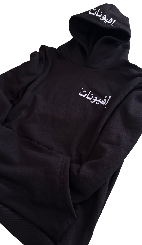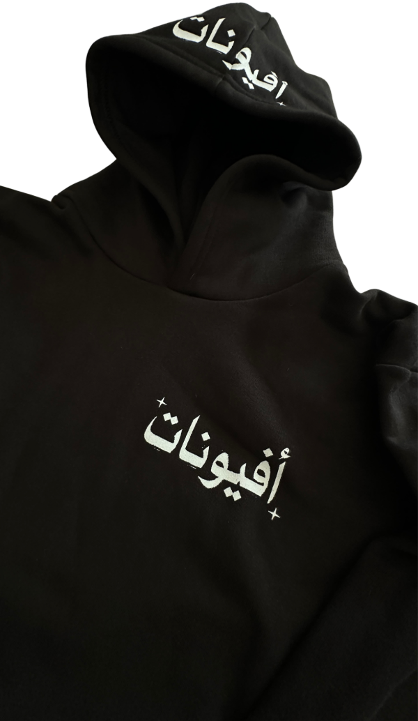 Estampa frontal y en capucha en árabe con efecto desgastado