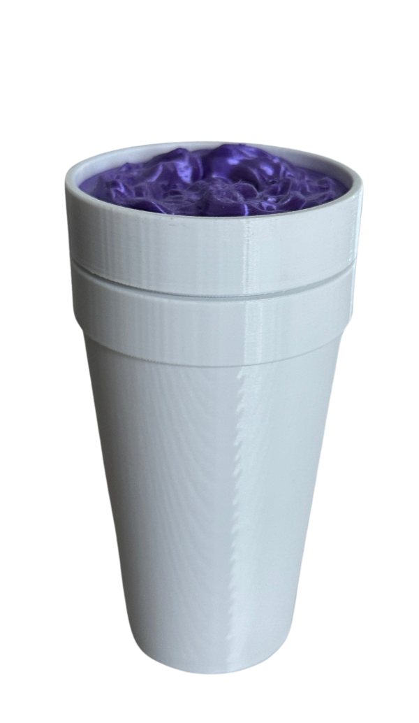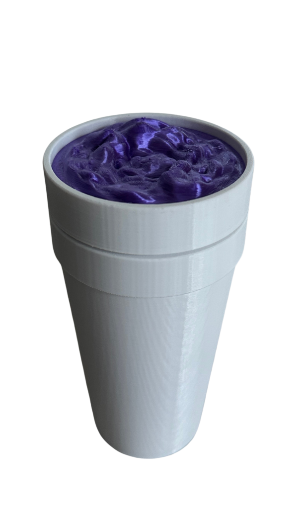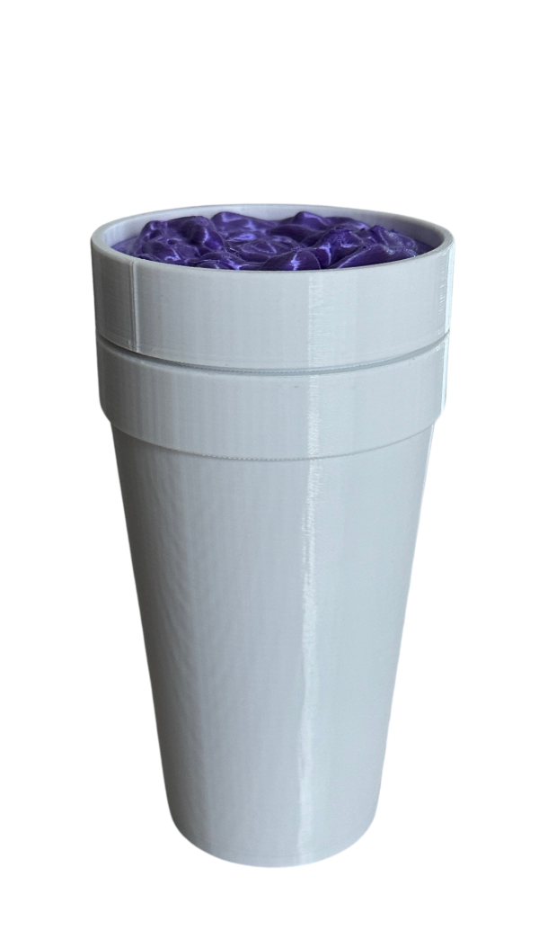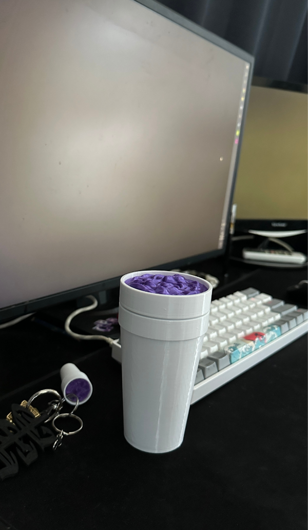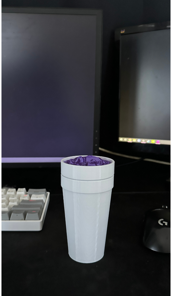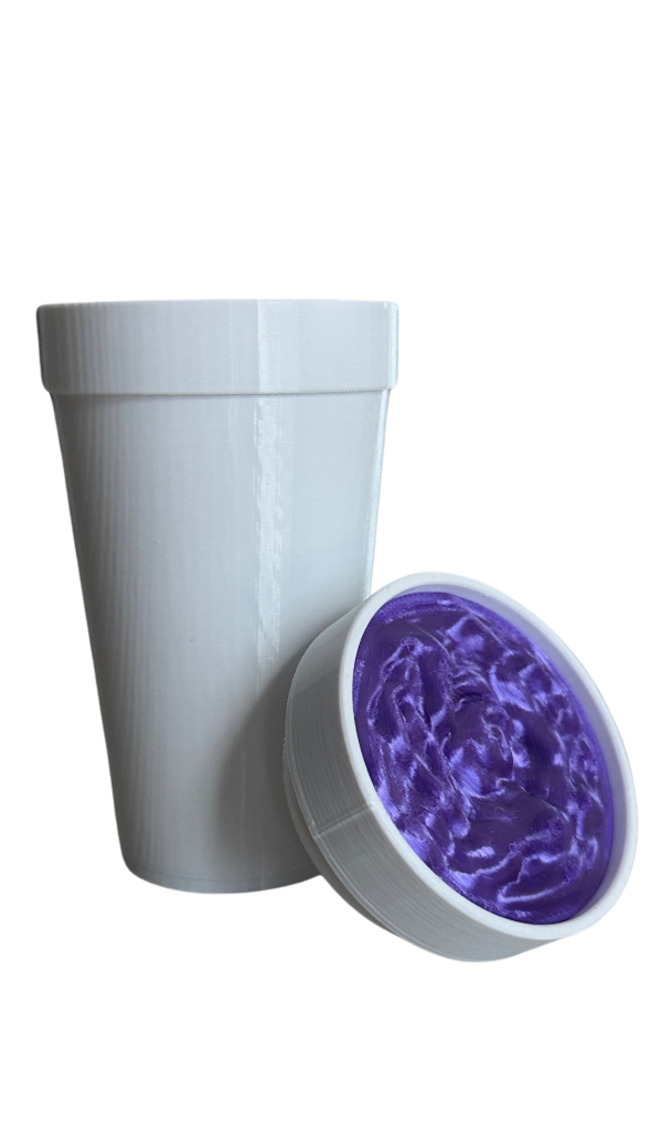 Doble vaso impreso en 3D con tapa a rosca en la base, pensado para guardar o transportar objetos.